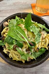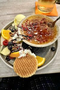 Sabine R: „Meine Spätzle mit Champignons und Käse waren überaus schmackhaft und auch die nett dekorierte Creme Brûlée als Nachtisch war toll. Sehr freundliche Servicemitarbeiter und ein gemütliches Ambiente im großzügigen Wintergarten.“