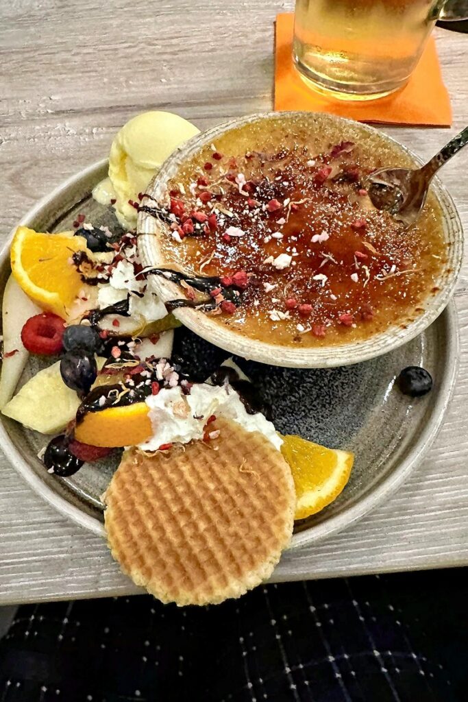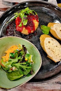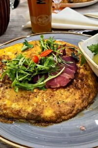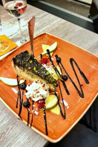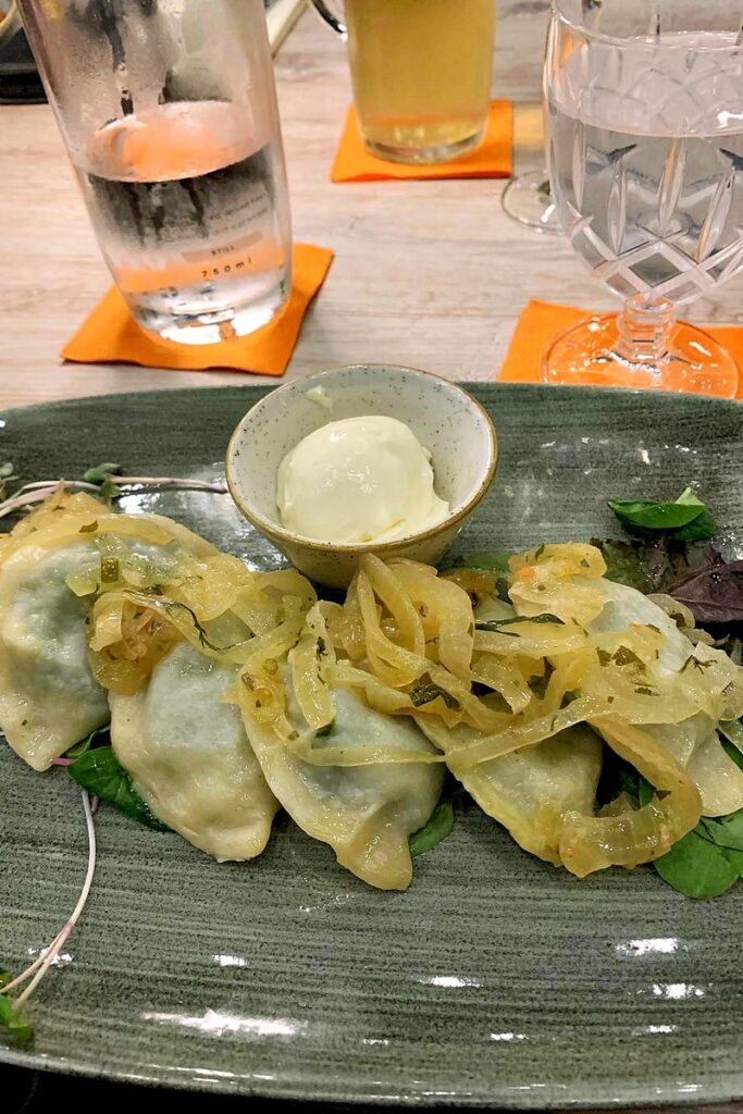 Frauke N: „Ich hatte Piroggen mit Spinat: superlecker! Der Teig dünn mit gedünsteten Zwiebeln und Sauerrahm. Nicht trocken und sehr delikat: Ich würde sie sofort wieder bestellen. Zum Nachtisch gab’s einen Cheesecake, sehr schön angerichtet und lecker. Die Stimmung war gut, nette Gespräche und die Lautstärke muss man halt ausblenden. Immer wieder gerne!“