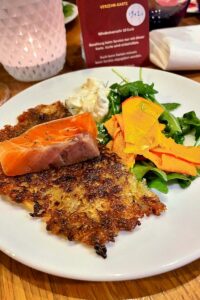 Röschti Scharbeutzer Art mit hausgebeizter Lachstranche aus Irland und Kürbis