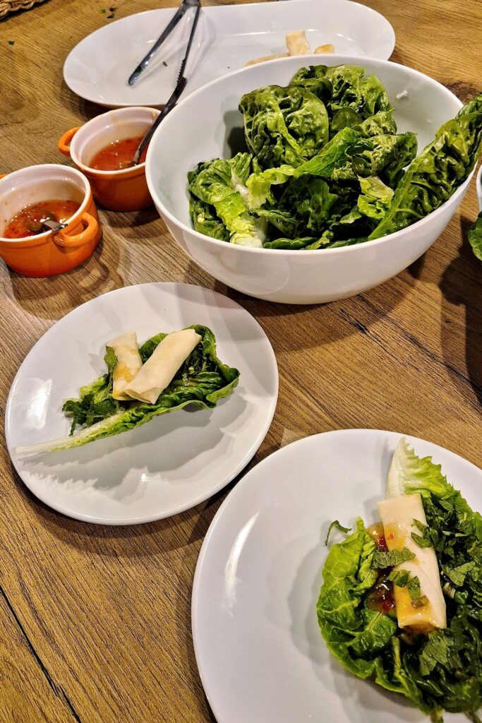 Mangosalat mit Erdnüssen und Limette aus Kambodscha, vietnamesische Frühlingsrollen mit Süß-Sauer-Sauce, gebratener Römersalat mit Minz-Raita aus Indien, eine duftende Tom-Kha-Suppe aus Thailand und japanisches Spitzkohl-Okonomiyaki.