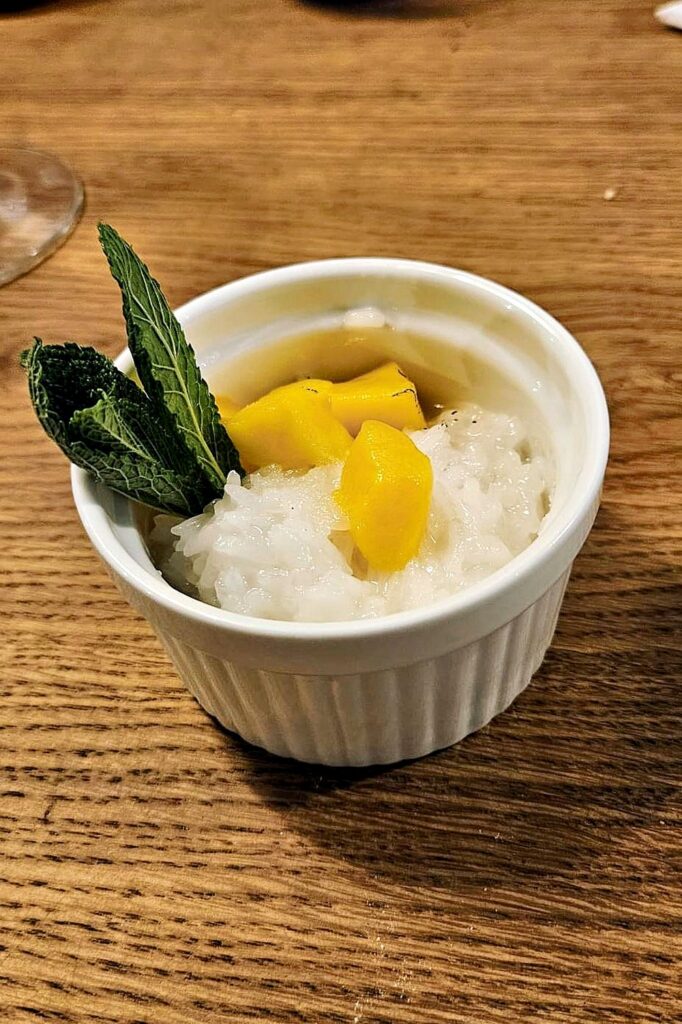 Zum süßen Abschluss gab es Sticky Rice mit Mango und flambiertem Karamell sowie eine feine Crème Caramel mit Kokos.