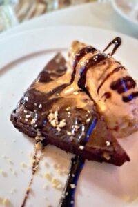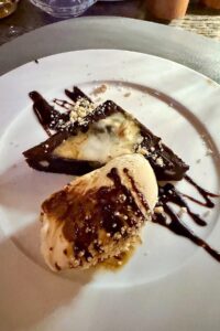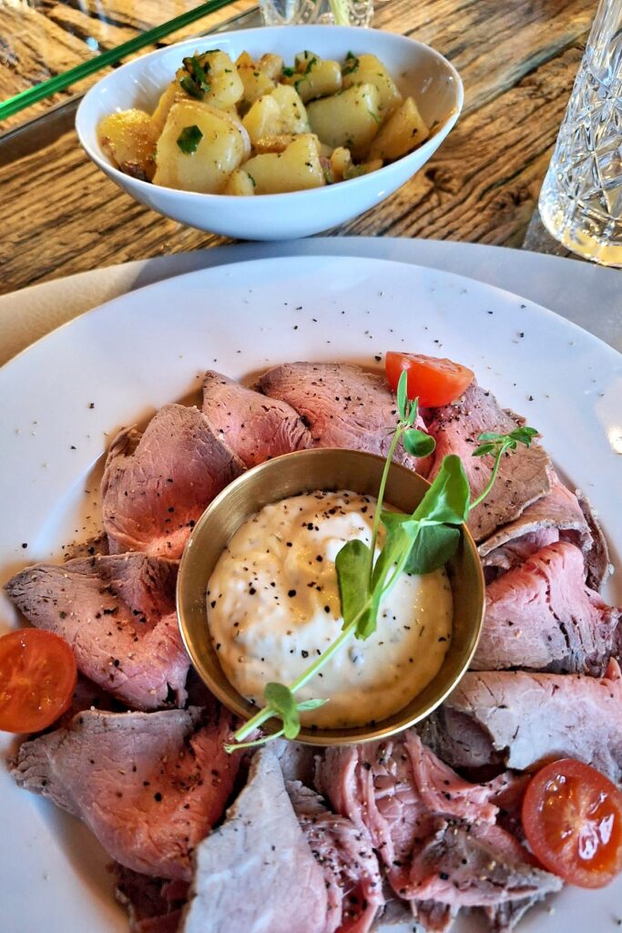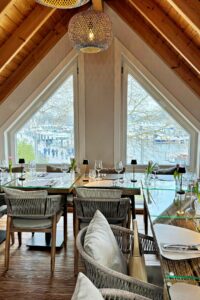 Charlotte J-H: „Mein Essen war gut, hat aber noch Luft nach oben. Zur Erklärung muss ich aber anführen, dass das Restaurant an diesem Freitagabend bis auf den letzten Platz ausgebucht war und man einem neuen Küchenteam auch etwas Zeit zum ‚Eingrooven‘ geben muss. Wir 15 quirligen Frauen mit unseren À la carte-Bestellungen, die ja alle gleichzeitig kommen sollen, waren bestimmt auch eine kleine Herausforderung für die Küche. Mal sehen, wie das in der Hauptsaison mit voller Terrasse wird.“