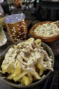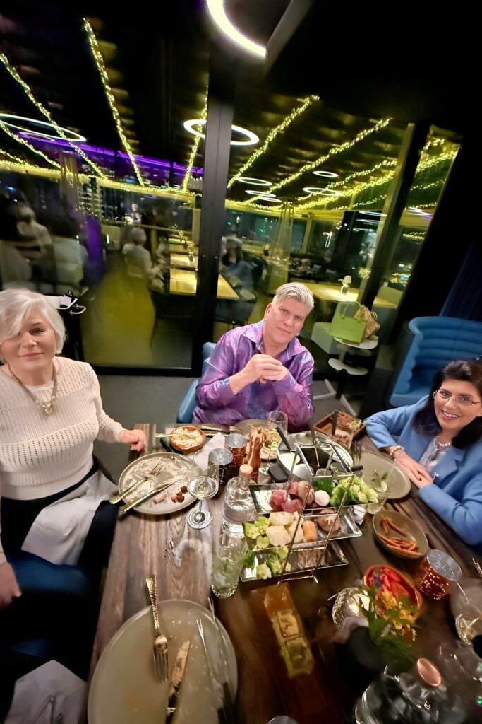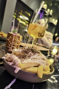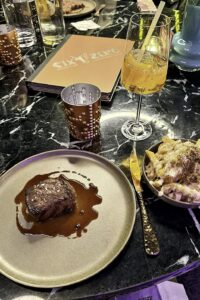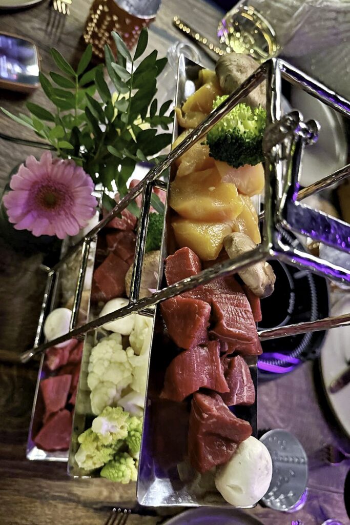 Frida D-D: Das „Flamingo“ mit fantastischer Atmosphäre – heute Abend das Essen mal in zwei verschiedenen Gruppen. Einmal mit Fleisch-Fondue in Brühe, einmal à la carte. Unser Fondue-Tisch war sehr ansprechend und vielseitig eingedeckt: Etageren mit Rind, Duroc Schwein und Maishähnchen, dazu verschiedene Gemüse. Und wer mochte, auch noch leckere Garnelen für Surf und Turf. Dazu gab es drei Salate und diverse Soßen, Pommes Frites mit Trüffelmayonaise und Süßkartoffel-Pommes. Es schmeckte einfach alles sehr lecker! Das Fleisch wunderbar zart, die Saucen passend für jeden Geschmack, die frischen Salate perfekt abgeschmeckt, und die Pommes als Beilagen wunderbar. Ein gelungener und sehr stimmungsvoller Abend, und das mit überwiegend antialkoholischen Getränken. Dry January! Absolute Empfehlung für das Restaurant!