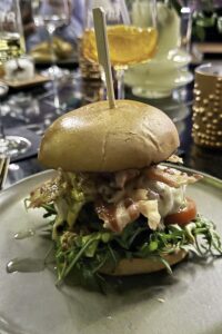 A la carte am Rundtisch: Die Neun testeten die reguläre Speisekarte vom des weit gereisten Küchenchefs Bastian Rau und wählten u.a. Freiland-Maishähnchen aus Galicien, Herford Prime Beef aus Nebraska oder Irland, Duroc Schwein aus Hessen und die Ostseescholle auf der Haut gebraten oder: „The Beast“ – ein 200-g-Burger mit Fleisch aus der hoteleigenen Wagyu-Zucht (29 Euro). Petra sagte Ja, ich will zum veganen Planted Steak mit Süßkartoffel-Pommes.