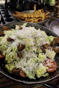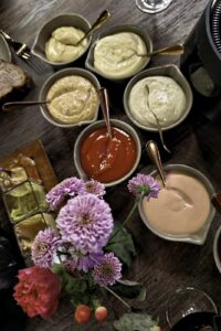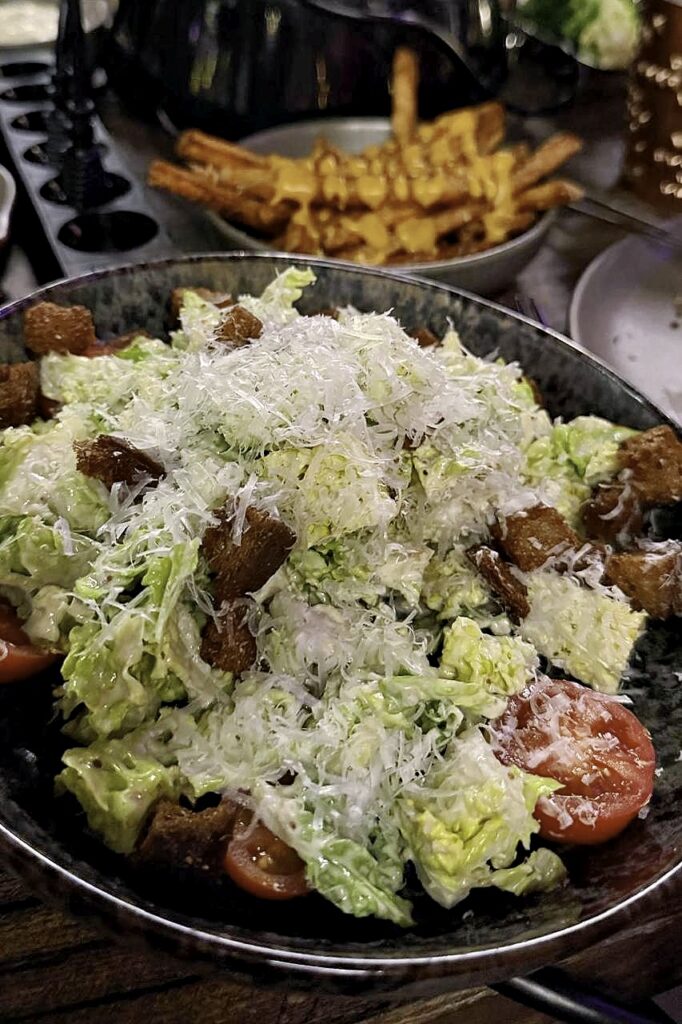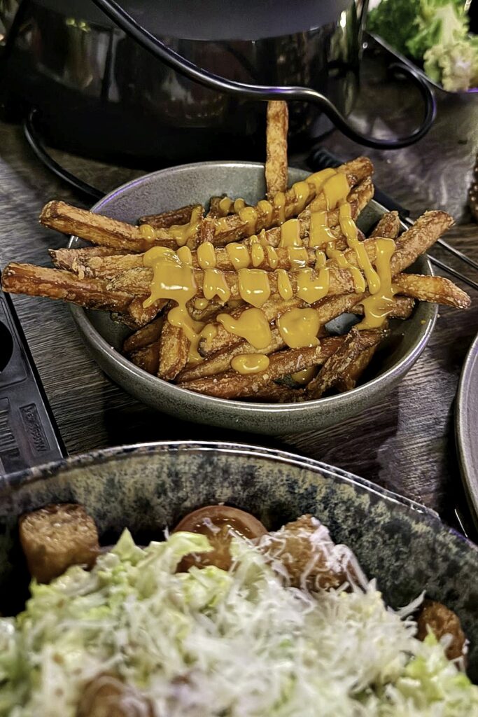 An der großen Fondue-Tafel gab’s drei Töpfe mit Brühe für Rinderfilet, Iberico Schwein (Eichelfütterung), Maishähnchen und Tiger Garnelen und Gemüse. Serviert vorab mit rustikalem Bauernbrot (mein persönlicher Favorit das begleitende Humus, das aber nur bei mir Anklang fand) und viele, viele Beilagen, so dass der Tisch fast zu klein wurde: Pommes Frites in zwei Varianten, Cole Slow, Ceasar Salad, Gurkensalat und ebenfalls hausgemachte Mixed Pickels. Der Preis für 59 Euro? Ja, absolut gerechtfertigt! Besser nicht ordern: eine Vorspeise vorneweg, das wäre nicht zu schaffen. Besser: ein Dessert zum Abschluss.